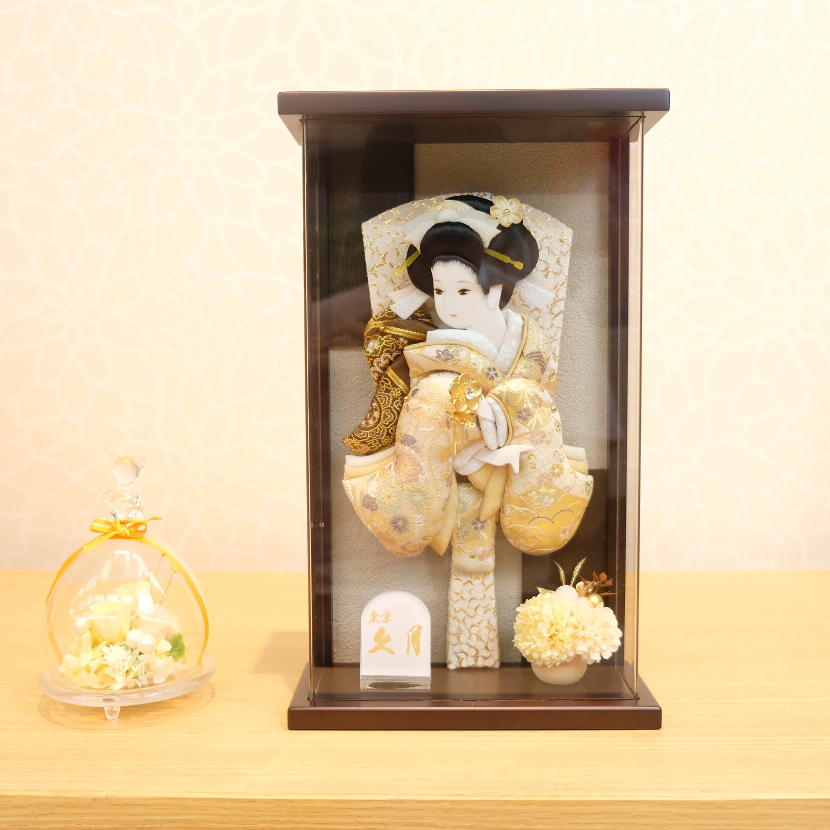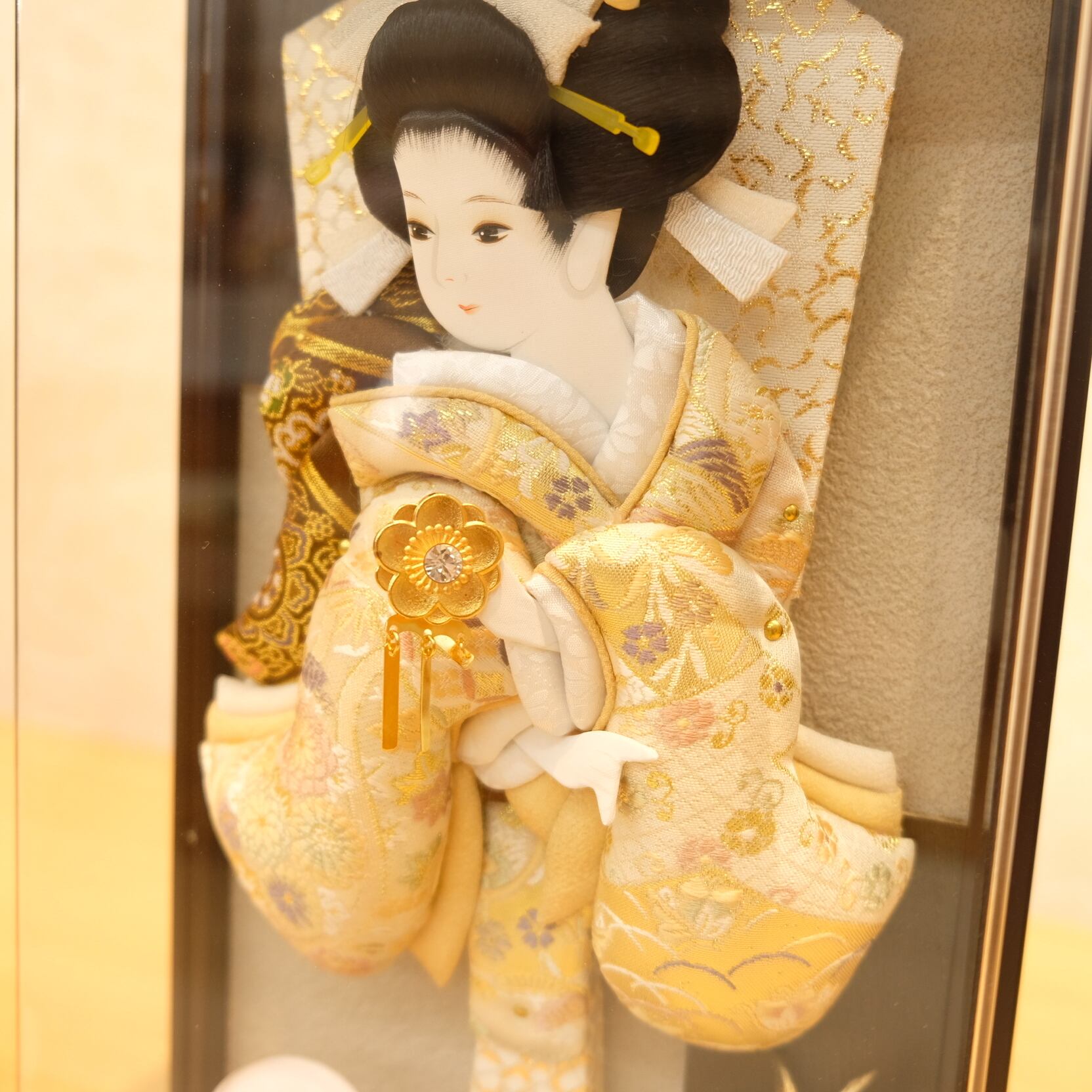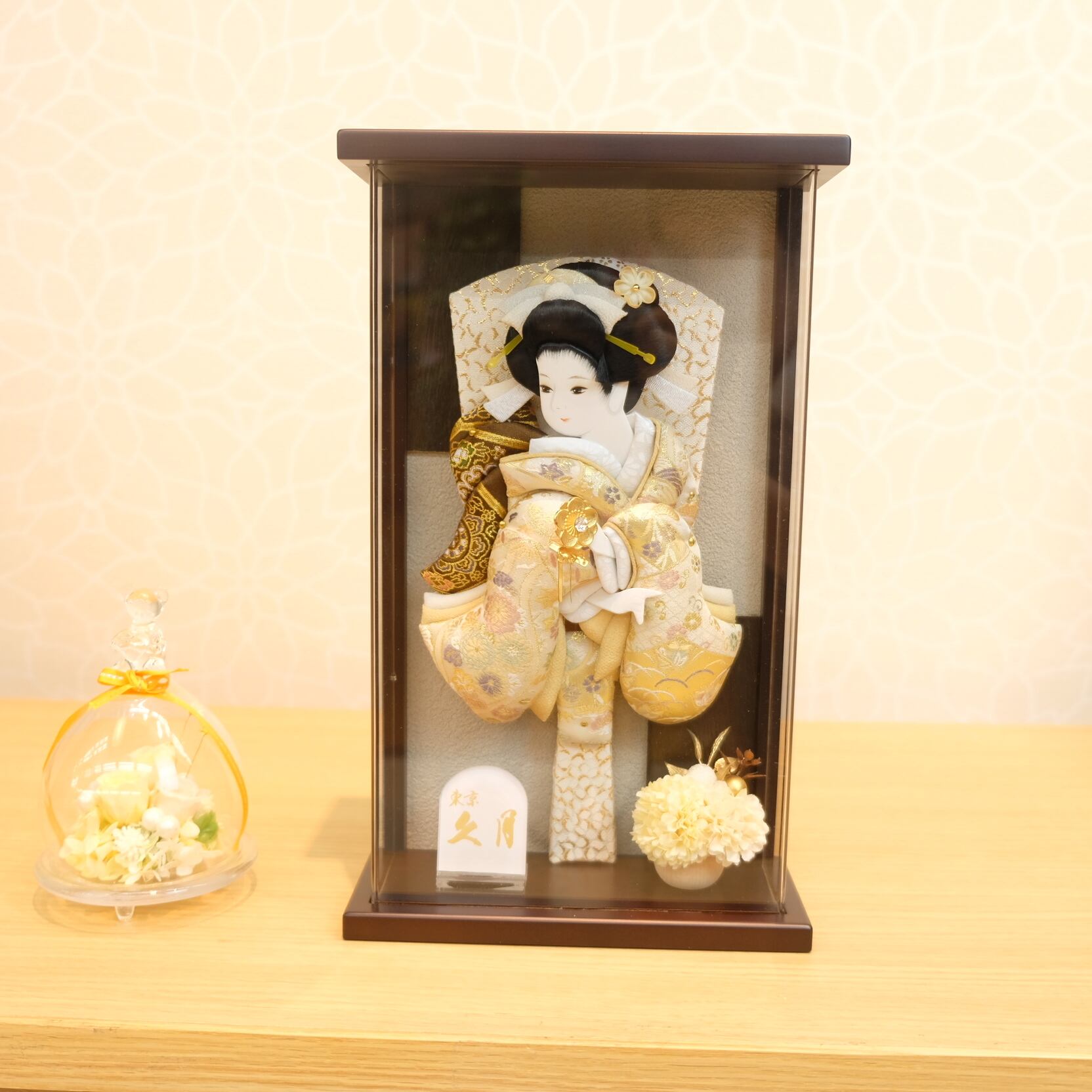 金色をベースにした絢爛豪華な衣裳が、シックな色合いのオーク調ケースと見事にマッチし、美しいコントラストを生み出しています。
