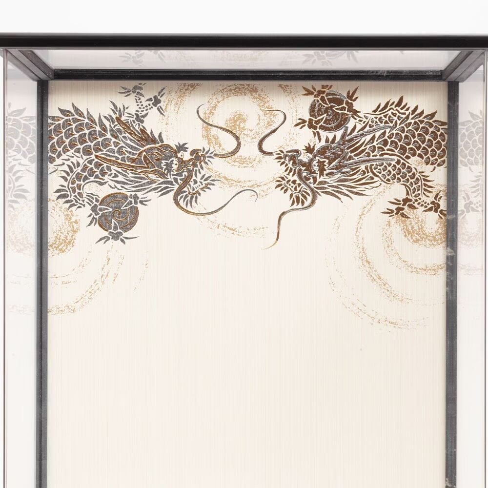 ケース背景に描いた龍の絵柄も印象的な、お祝いに相応しい勇壮なお飾りです。