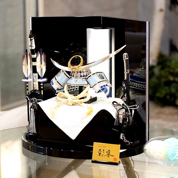 ■上杉謙信公を象徴する「日輪弦月前立」をあつらえた、シルバーを基調とした爽やかな青が特徴の兜。袱紗に京都の龍村美術織物を使用しております。黒塗りの台屏風とLEDの優しい明りが凛とした美しさを際立たせます。