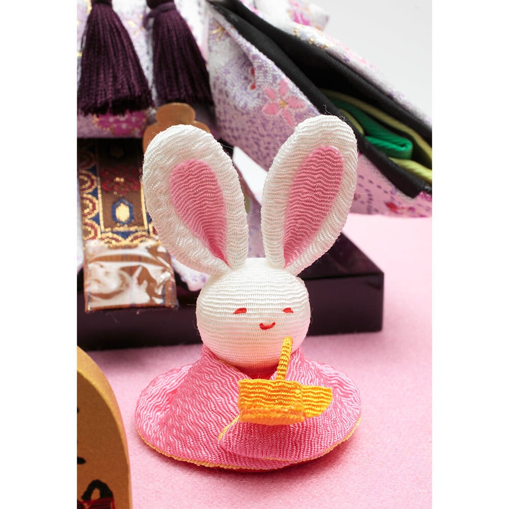 ■可愛らしいちりめんの"うさぎ"を官女に配した、春らしい明るい色彩が魅力のおひなさまです。