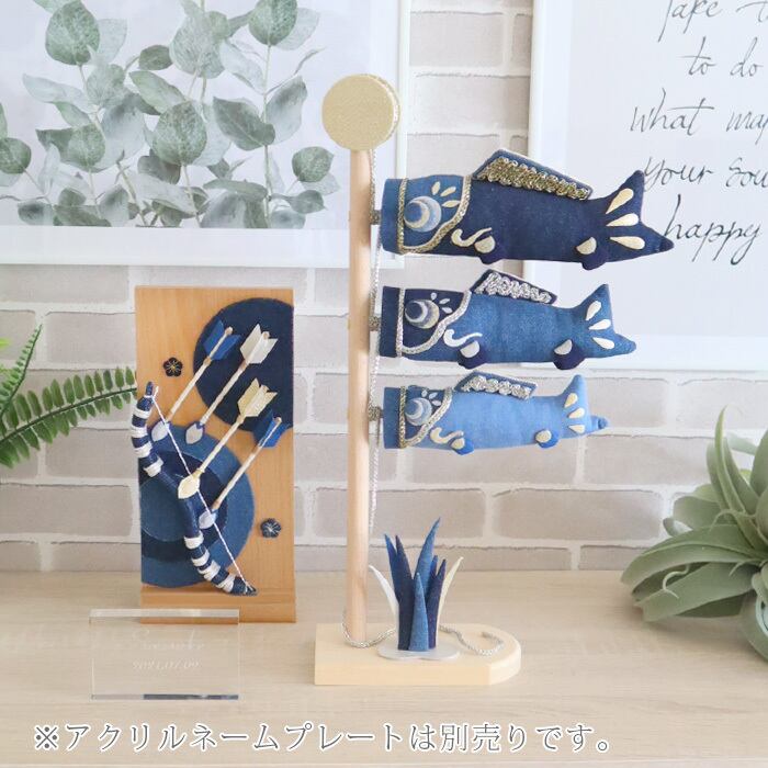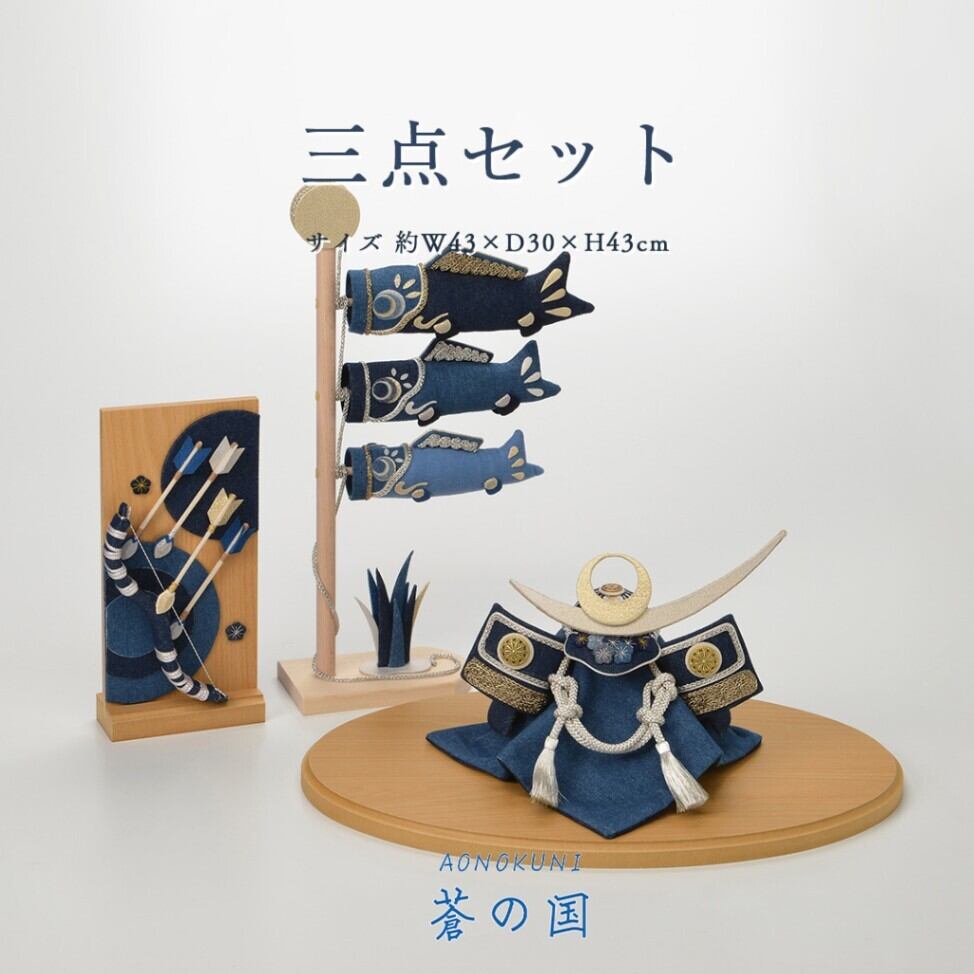 藍の中でも身近なカジュアル素材「デニム」を節句に取り入れ、日本らしさを演出しました。「蒼の国」は日本の伝統色をデニムで表現し、ゴールドをプラスすることで現代の住空間にマッチするモダンな佇まいを演出しています。