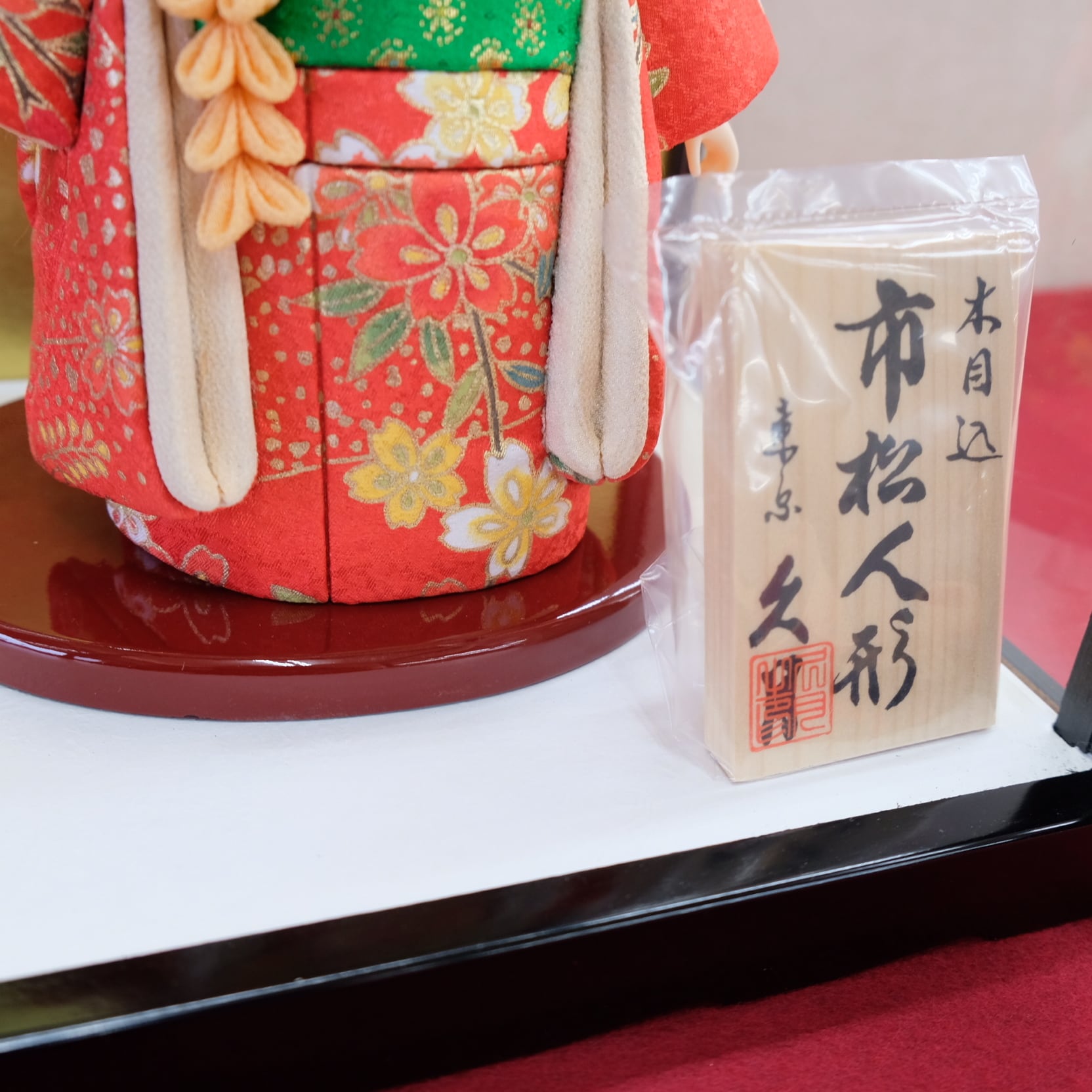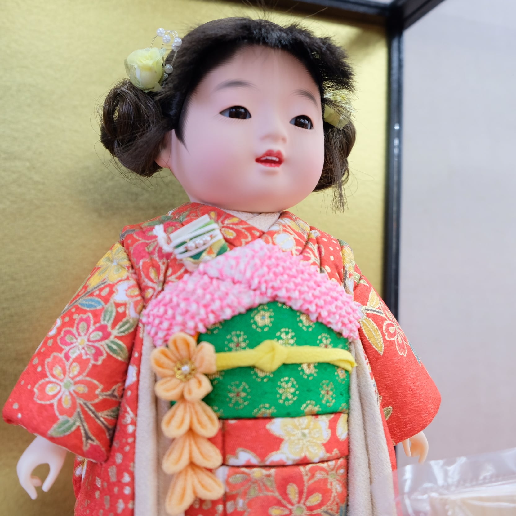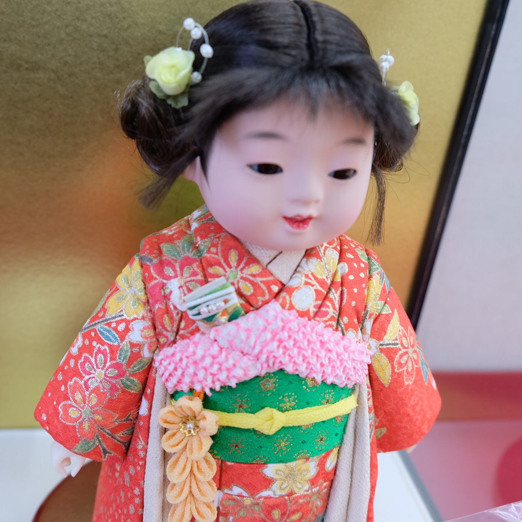 あどけなさのある可愛らしい幼顔のお人形で、魔除けの意味を持つ赤を基調とした衣裳が華やかさを感じさせます。