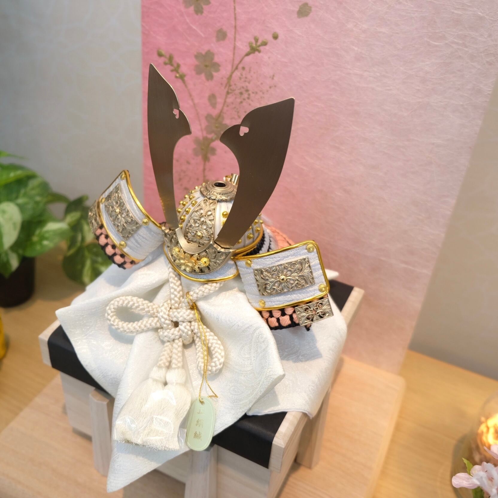 洋室、和室のどちらにも合う落ち着いた色合いの兜飾りです。