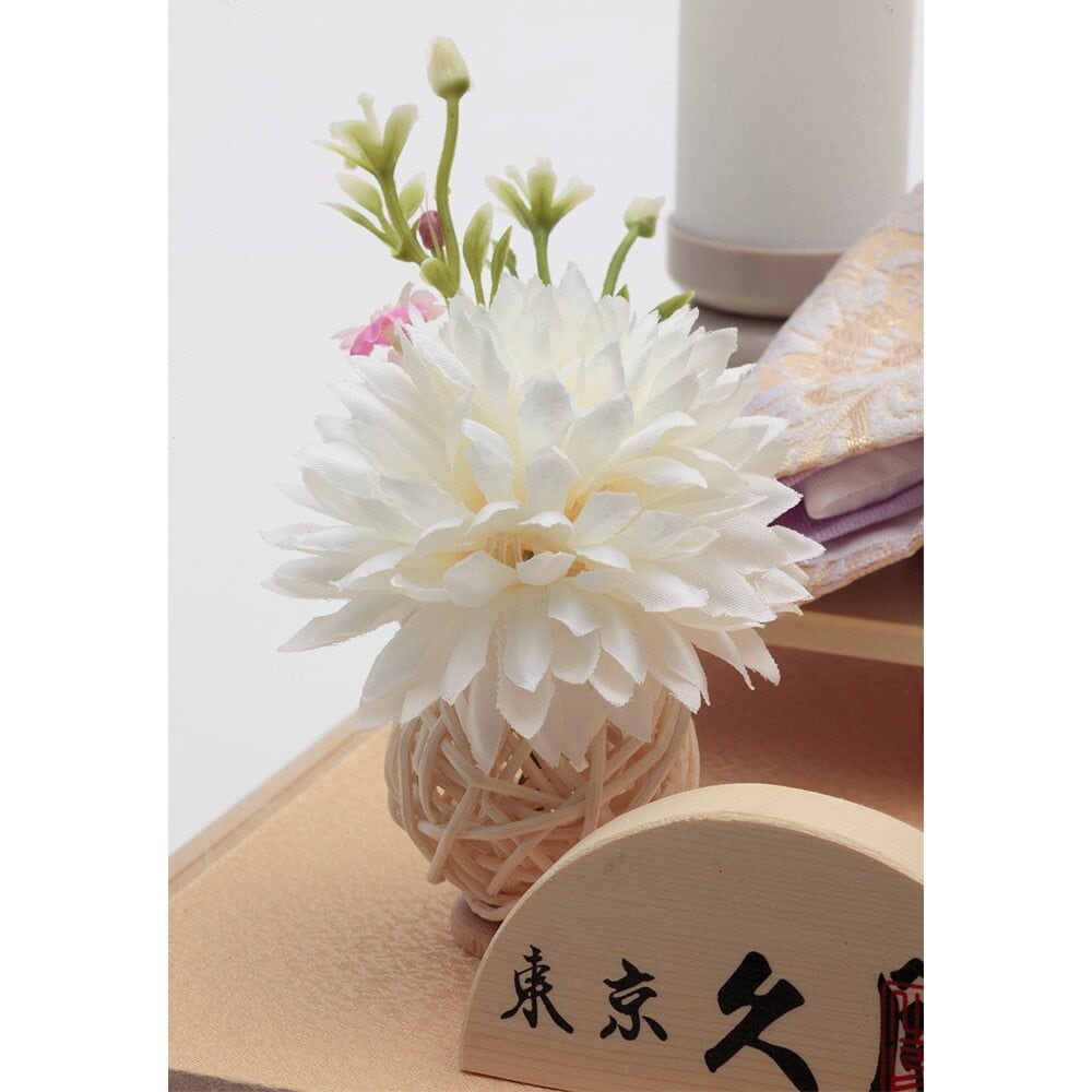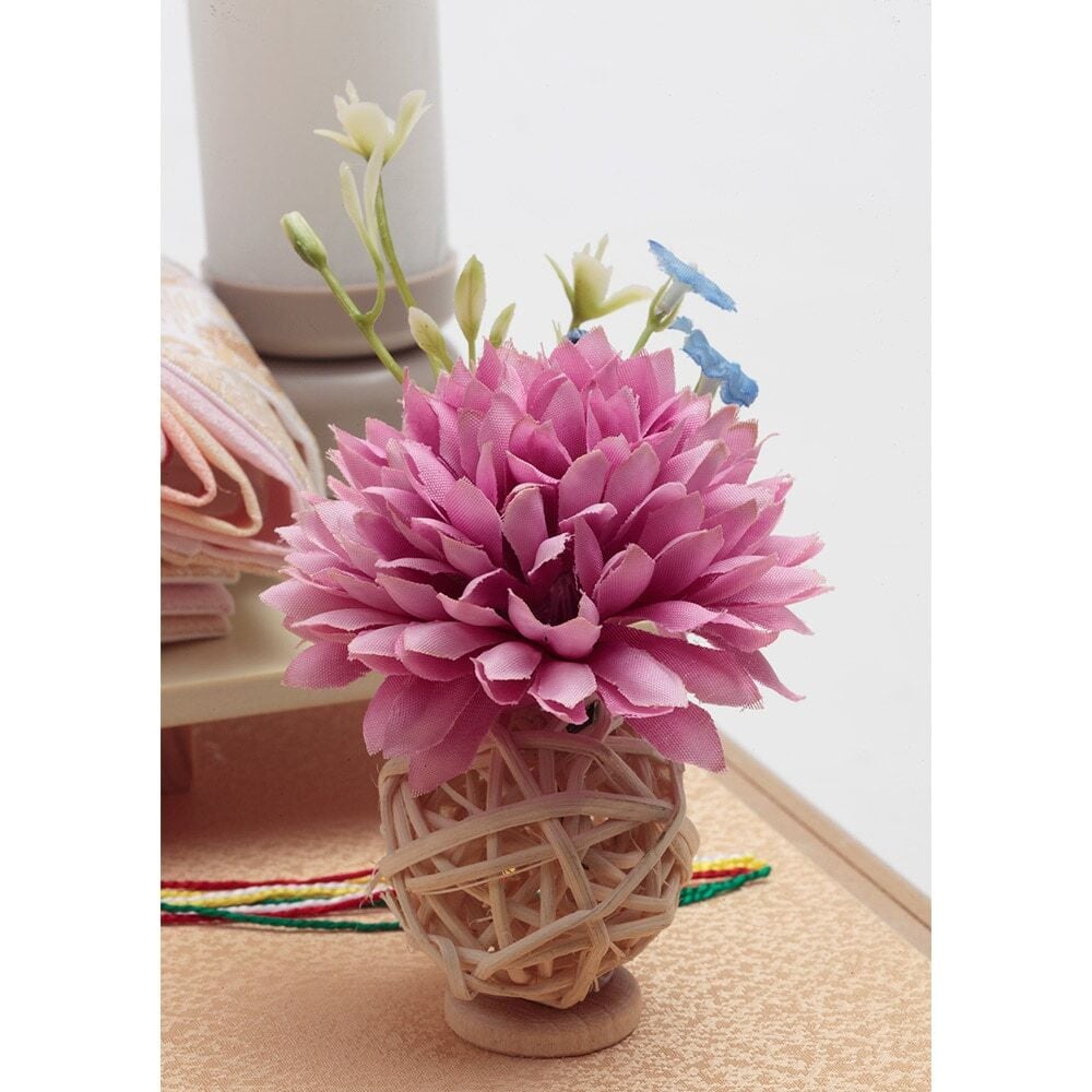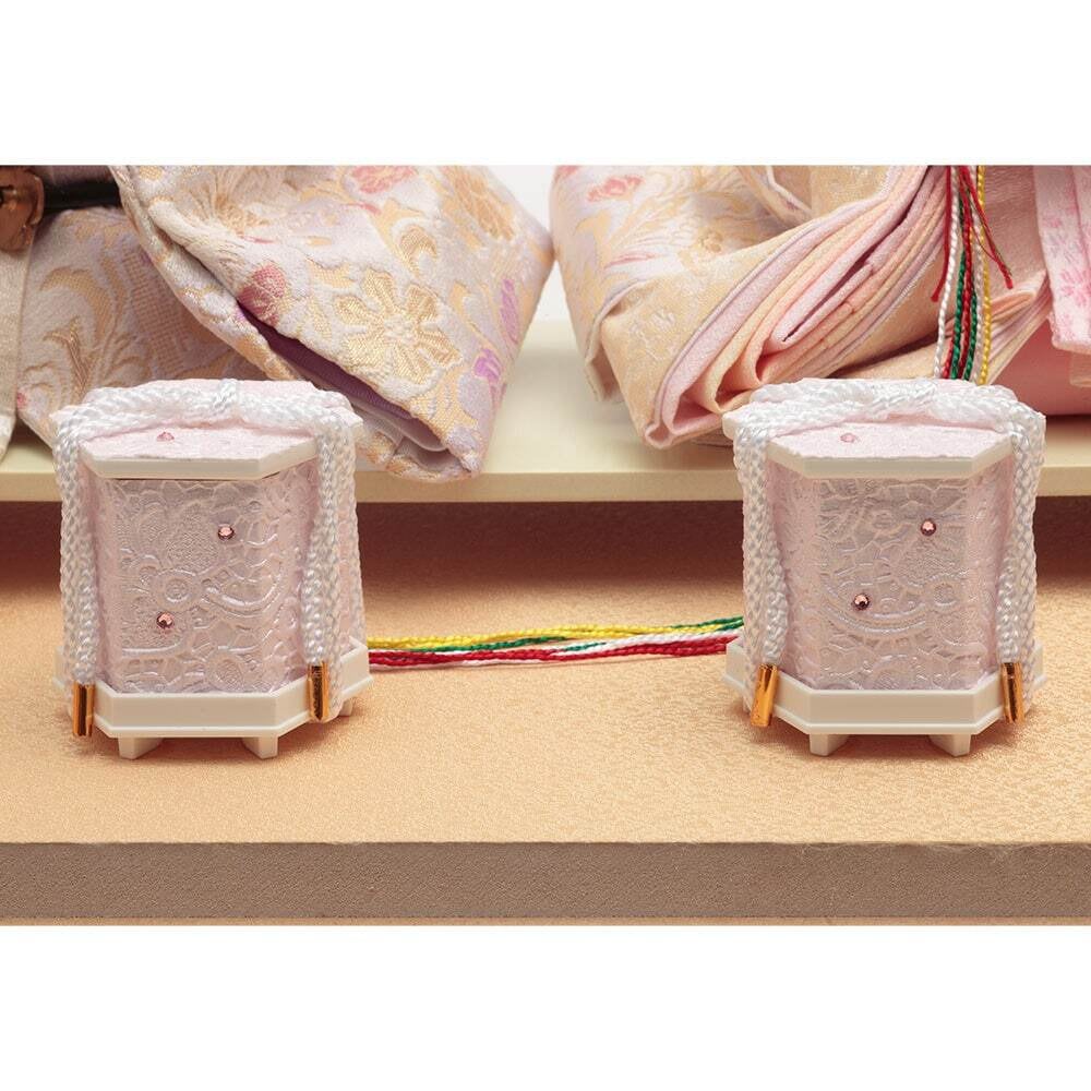 桜橘の代わりに配したモダンなテイストの花飾りやお道具も春の晴れの日を華やかに彩る、女の子のお祝いに相応しい可愛らしさ溢れるお飾りです。