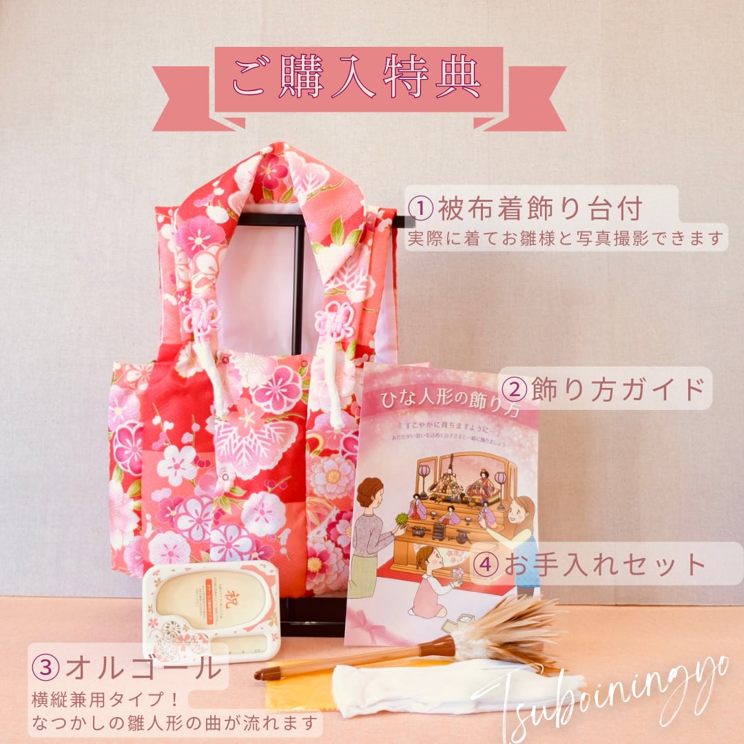 爽やかな白を基調とした色合いで全体をコーディネートした、フローリングのお部屋にも違和感無くマッチする親王ケース飾りです。