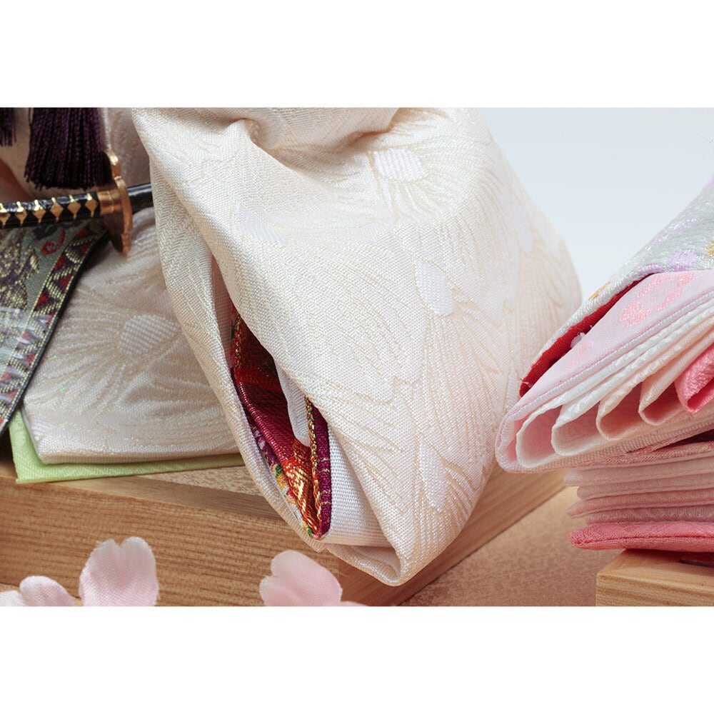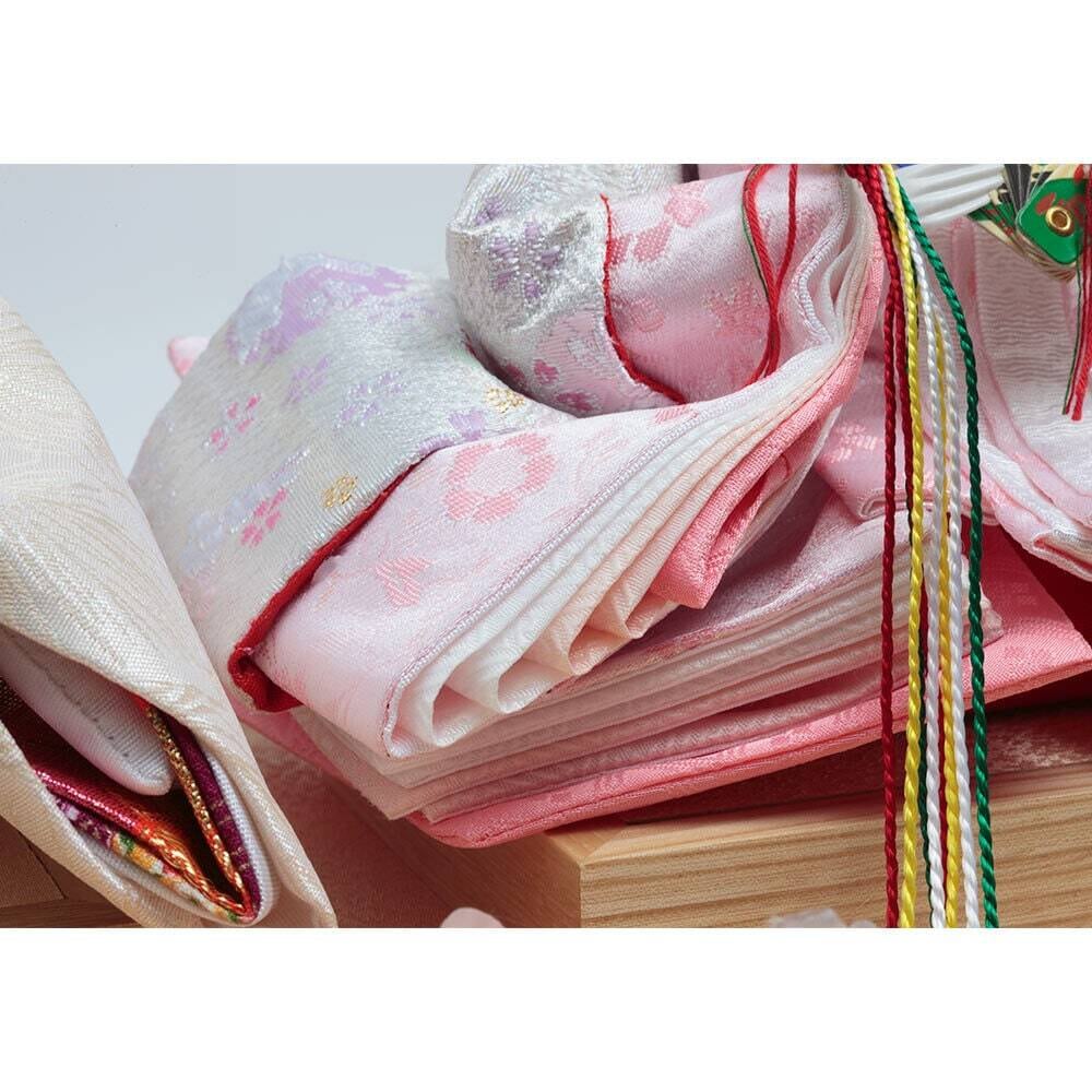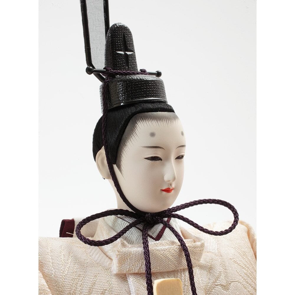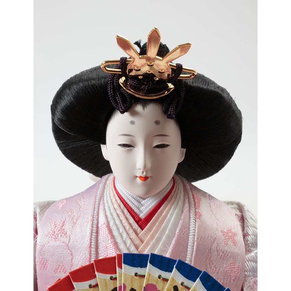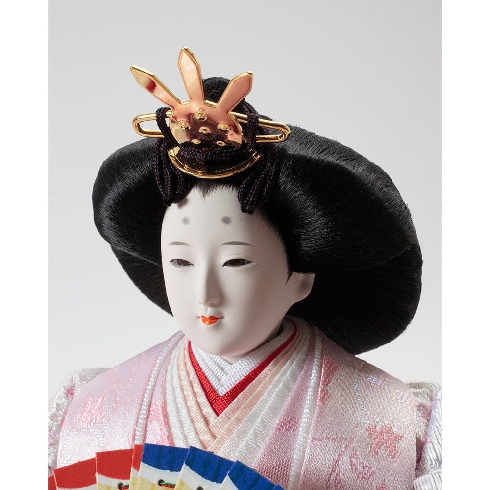 口を閉じて優しく微笑む上品なお人形のお顔立ちが印象的な、春らしい明るい色彩が魅力のおひなさまです。