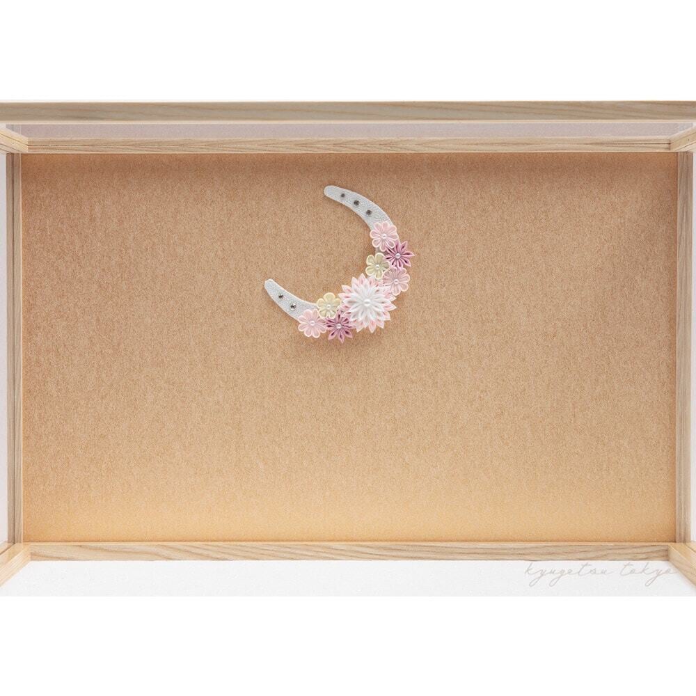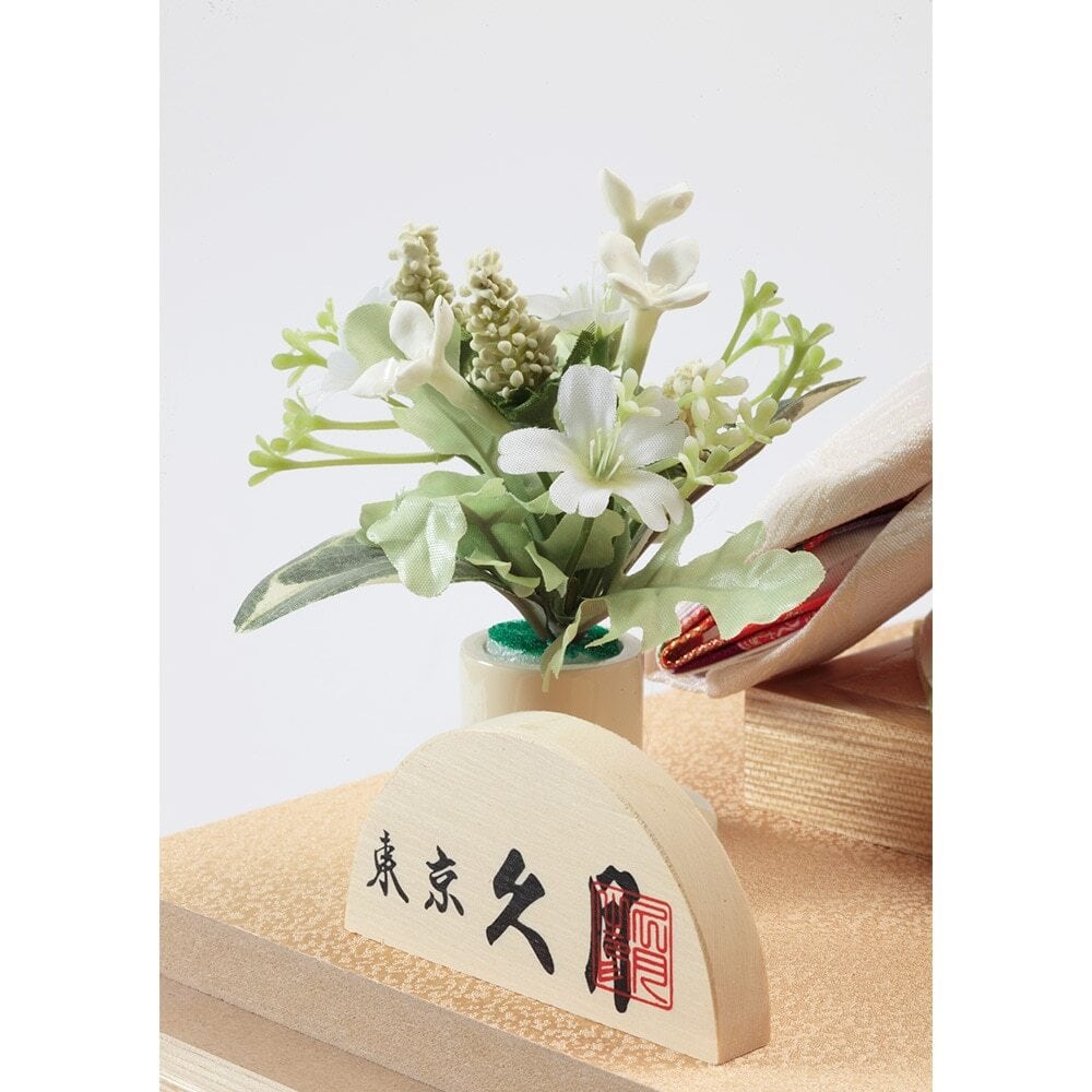 ケース背景にあしらったお洒落な雰囲気の花飾りが、優美で明るい色合いのお人形を見事に引き立てます。
