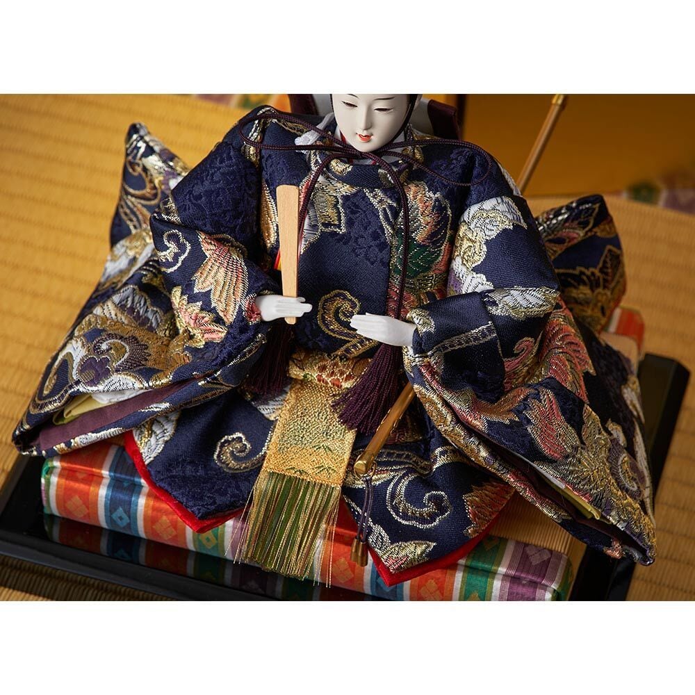豪華な西陣織金襴をまとった煌びやかなお人形が、趣のある飾り台に見事に映えます。