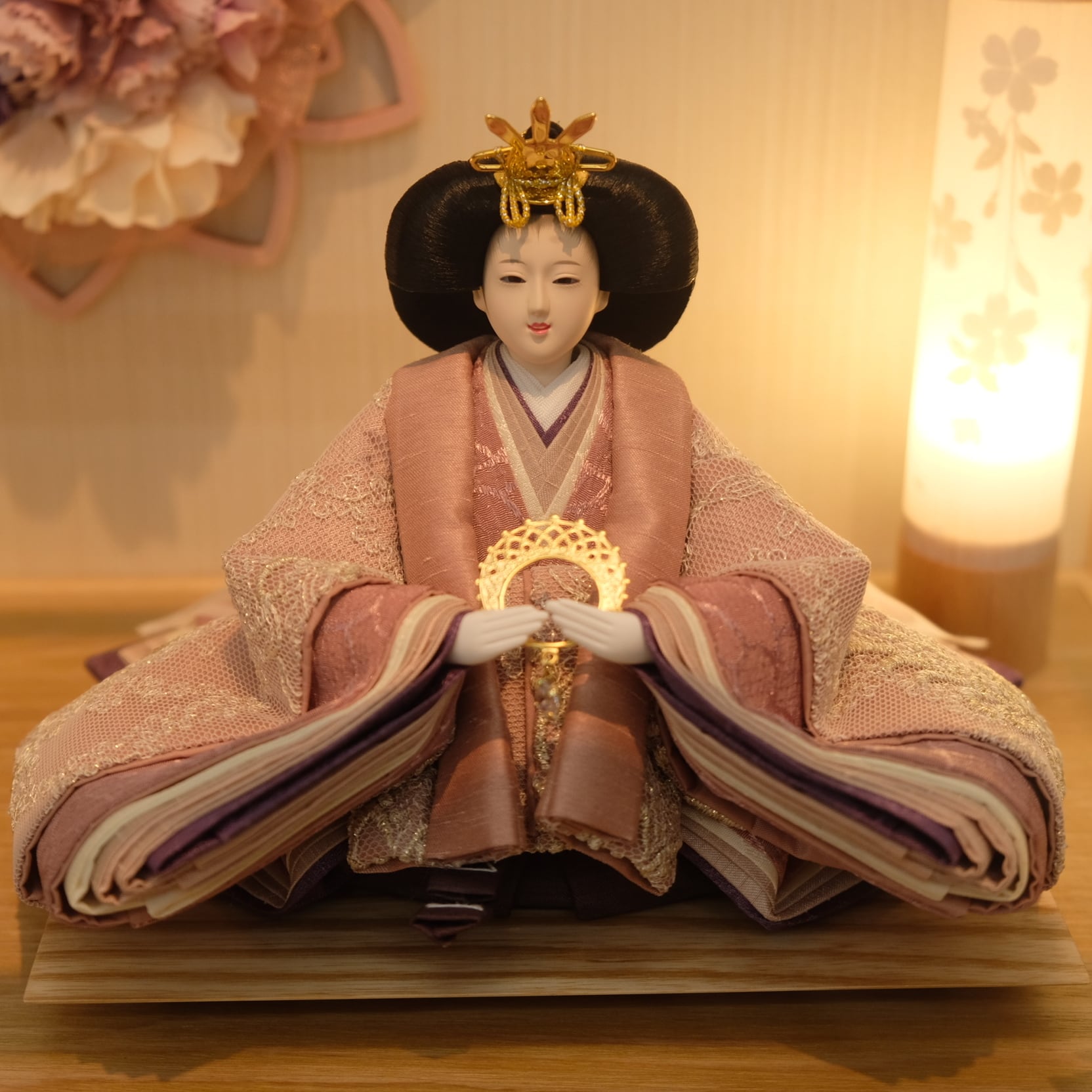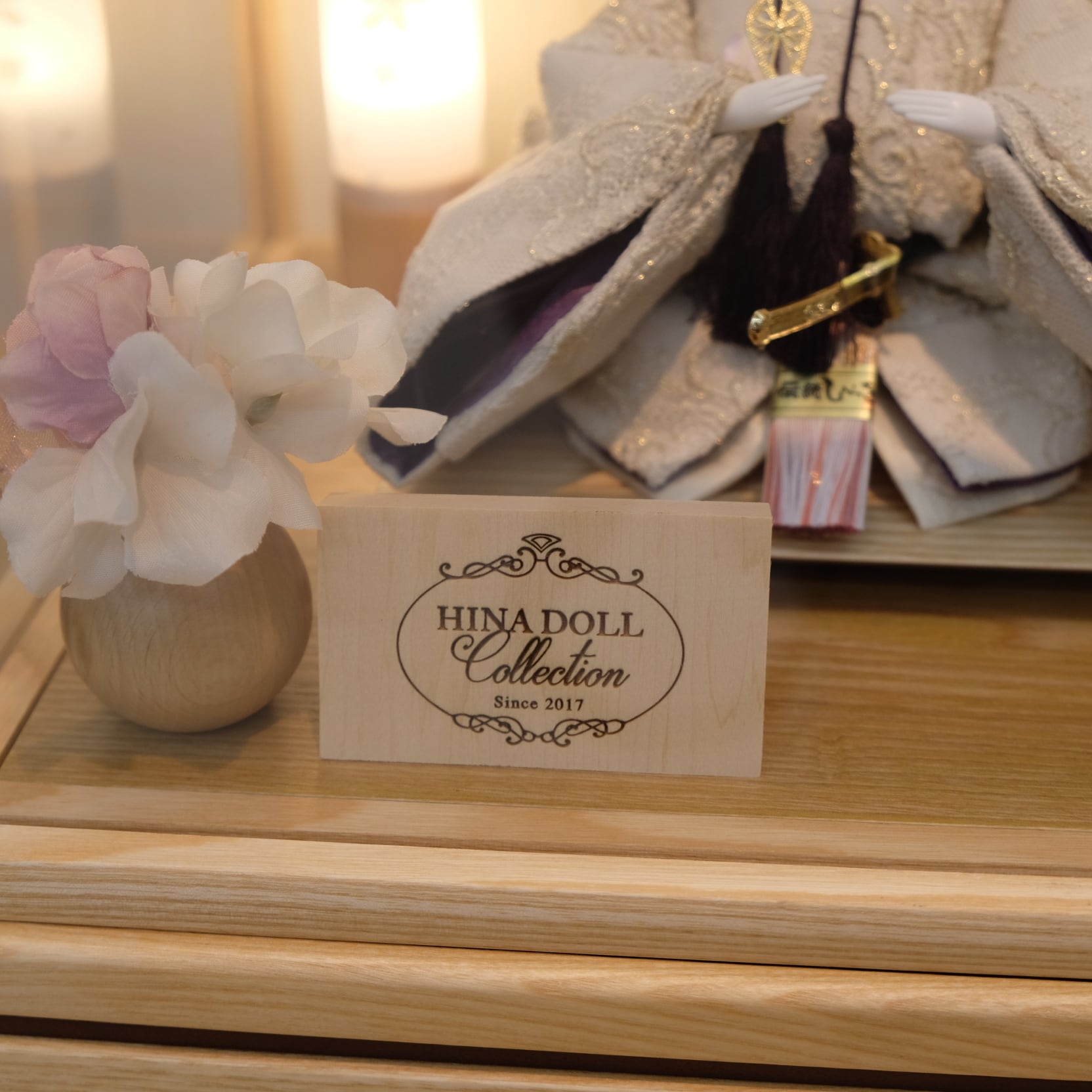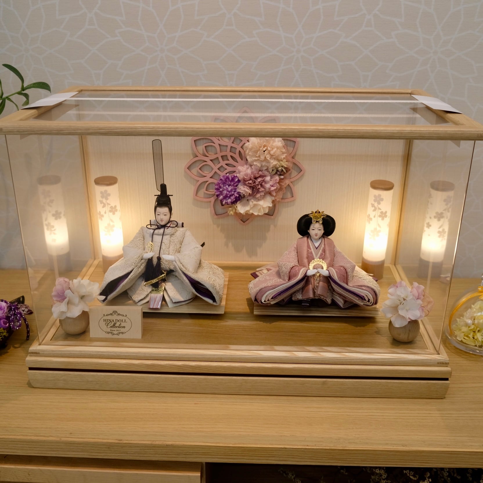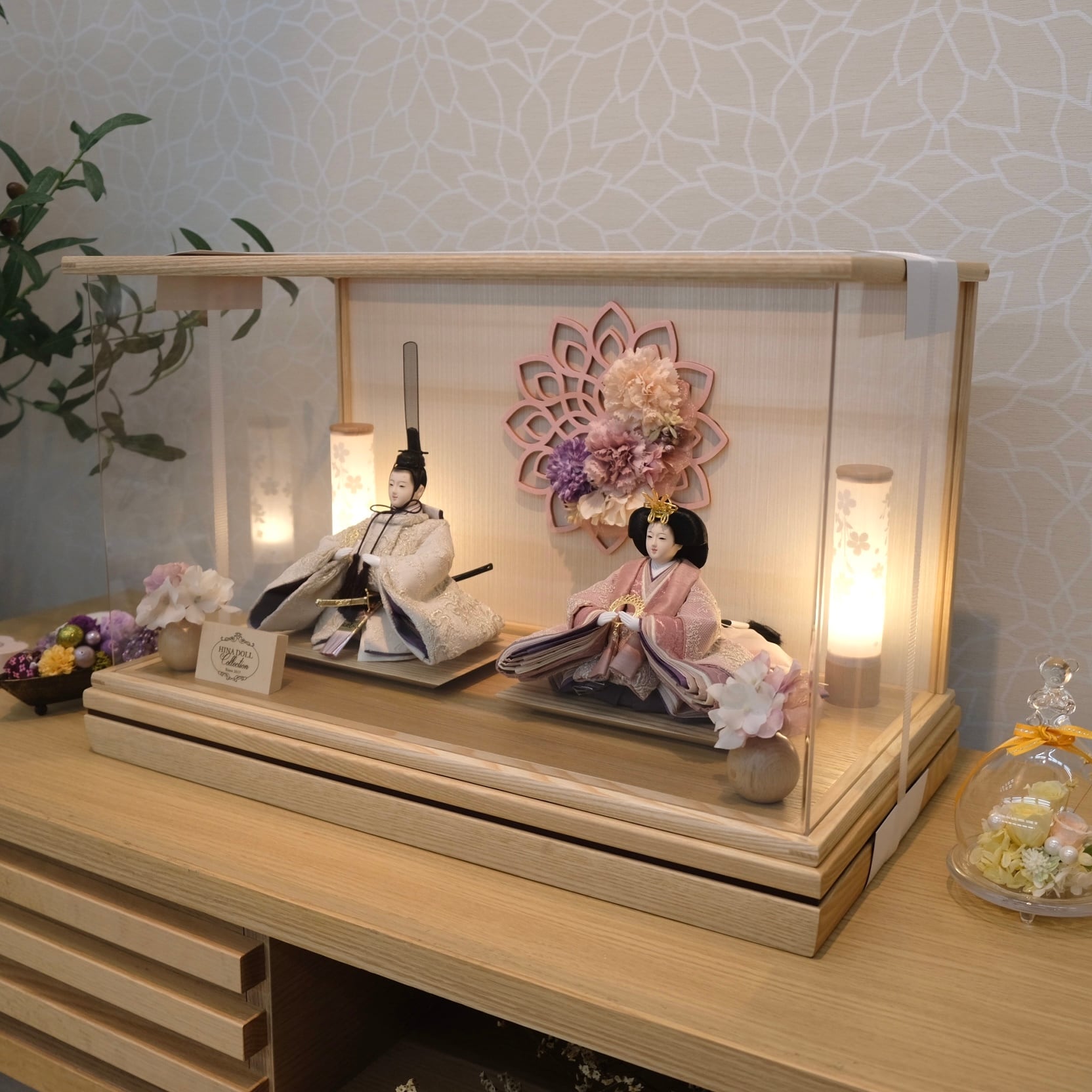 優美に微笑む可愛らしいお人形が上品なアクリルケースに映える、フローリングのお部屋にも違和感無くマッチするお飾りです。